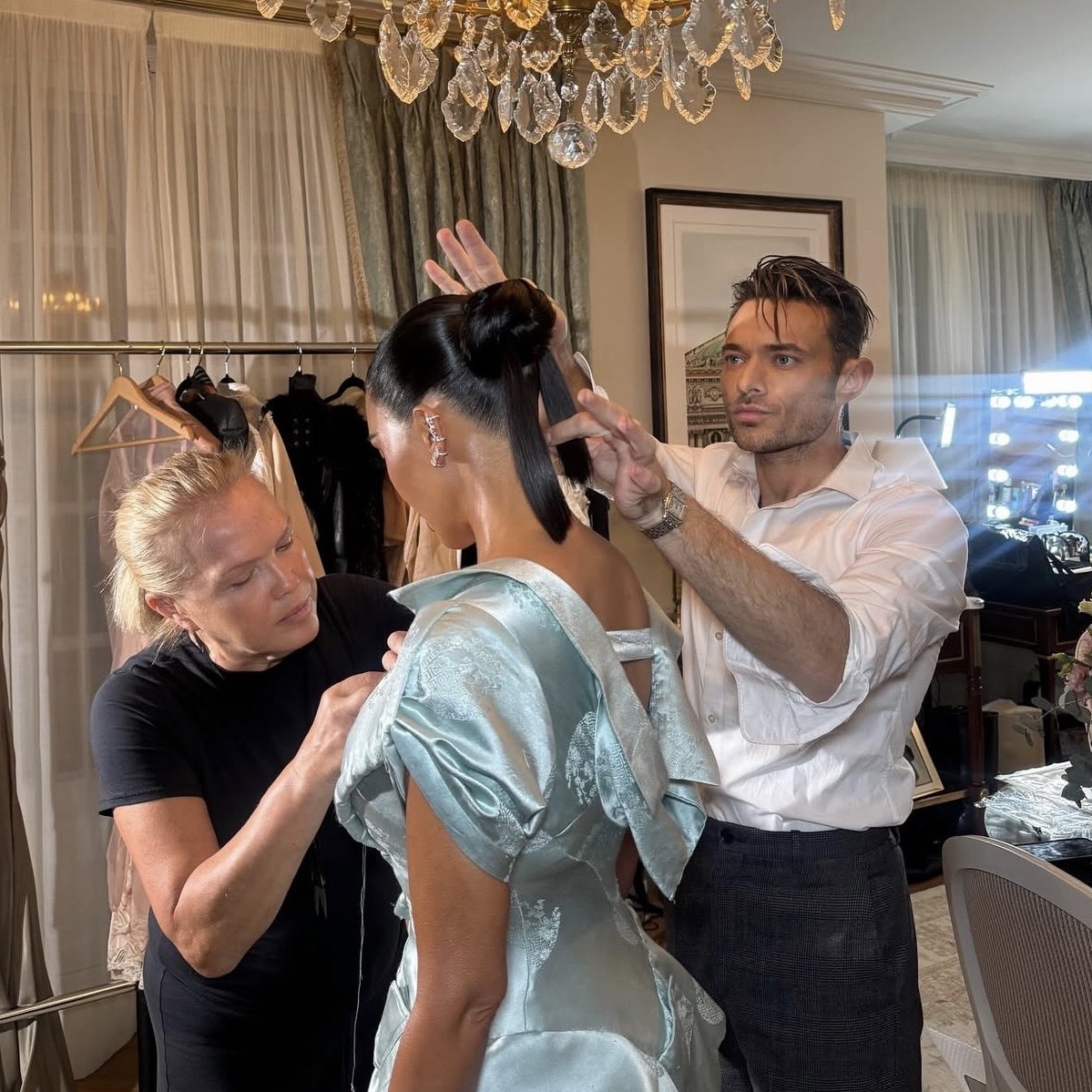 “Kim was wearing a Dior dress, so I wanted to keep her hair runway style. She definitely knows how to break stereotypes and try new things, so I gave this classic and elegant hairstyle a very modern twist,” the stylist said.