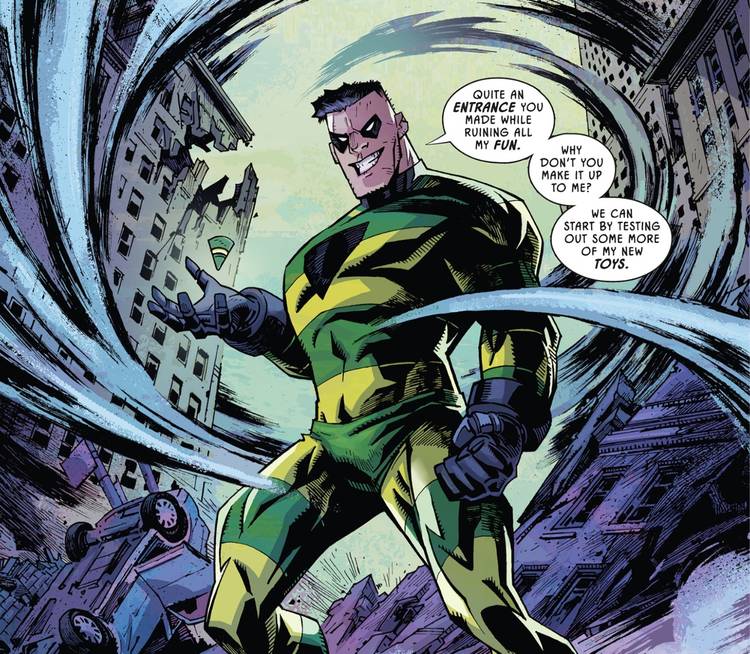 In the DCU, spinning topo Roscoe Dillon (his real name), is a criminal who steals the components of his weapons, which he intends to later sell at the highest possible value.