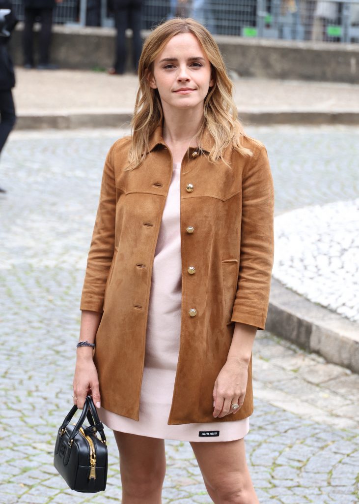 Emma Watson was released in a brown shadow and pale pink dress-mini suede jacket. However, the attention of the photographers immediately pulled a vintage engagement ring with diamonds on a famous ring finger.