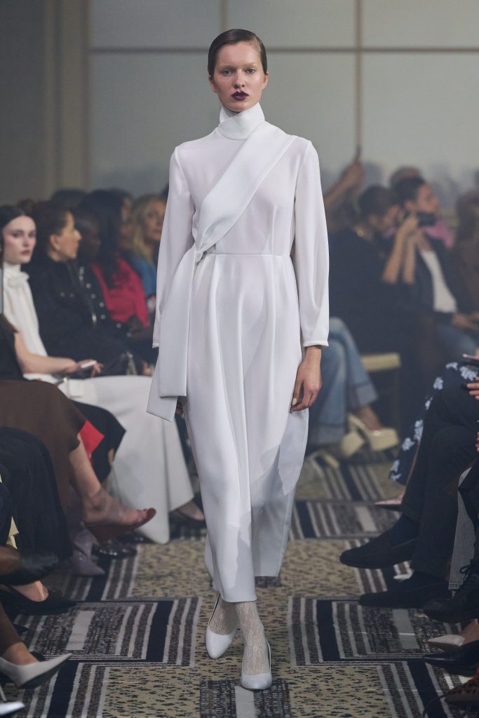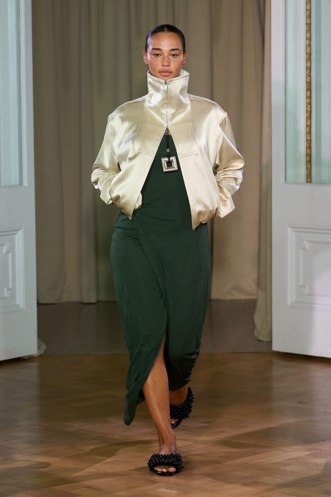 This season, it turns out that London designers are obsessed with high necklines (apparently the weather still dictates the rules). Moreover, they are used not only in everyday images, but also in the evening. A striking example is Dara Findikoglu, Erdem and Edeline Lee. However, our personal form-favorite appeared in the Nanushka Show-A satin jacket, a milky tone with a collar stand and double zipper.