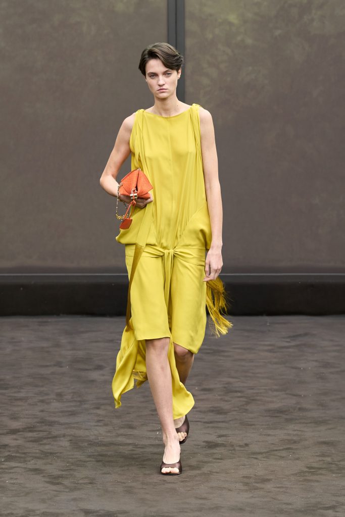 The color yellow is quickly catching up with the fashion industry. If last season there was a butter shade in trend, now the design workshop offers to use the entire palette. For example, we see images of a bright lemon color in the Ferragamo show, in Tod’s show, in a mustard shade, and in the Versace Dario Vitale-A-gentle yellow dress collection.