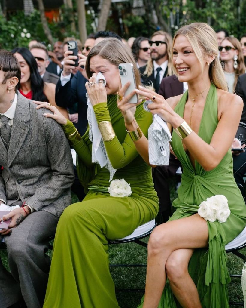 Bella appeared in a low-cut and pleated flowing dress. Gigi opted for a high-neck maxi dress with flowing sleeves and gold cuffs.