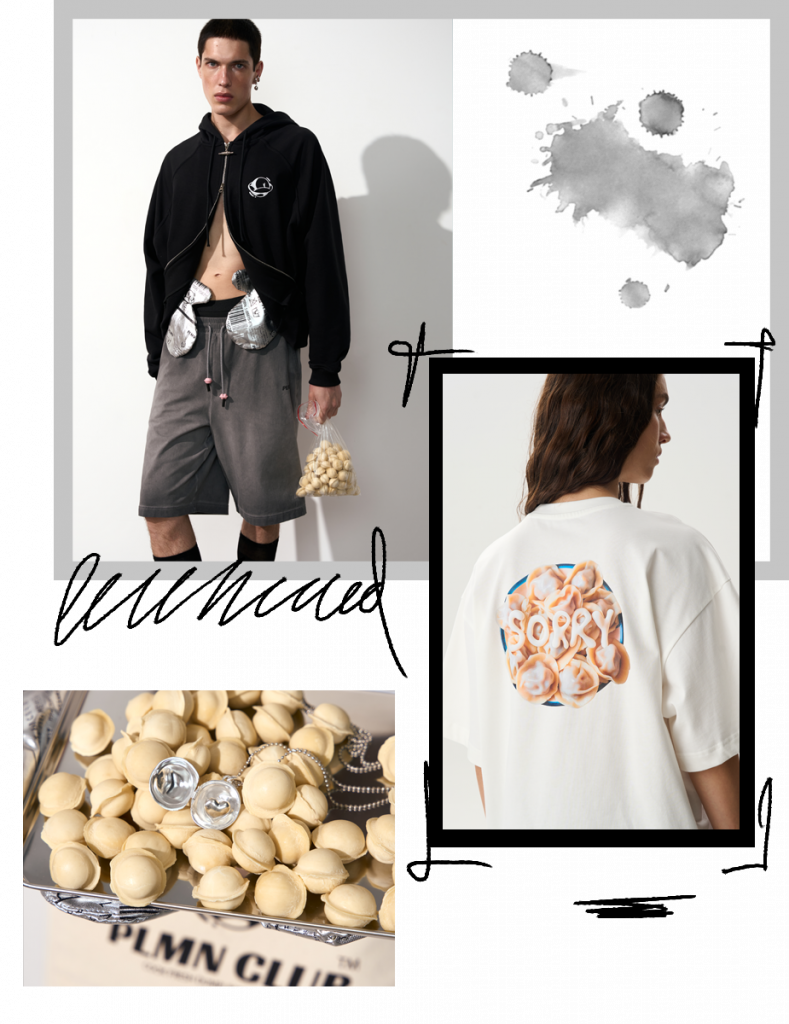 What if the inspiration for a clothing brand was meatballs? This is how PLMN was born – the project of Andrei and Galina Glinsky, where nostalgia for simple pleasures turned into fashionable irony. The brand’s first capsule is a play on associations and everyday symbols: a shopper transforming into an apron, a noodle lock on a hoodie, dumpling-beaded strings on shorts, and a dumpling-shaped pendant with removable “filling.”