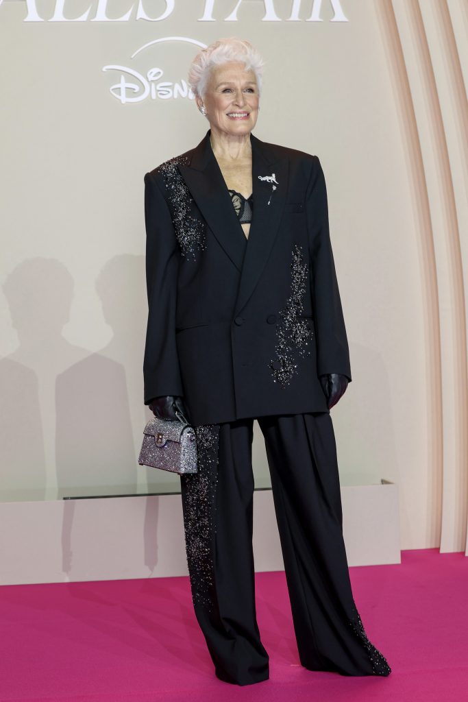 Following Pamela Anderson, Glenn Close shows that age only increases the level of your fashion output. The first look is a luxurious black formal Carolina Herrera gown, complete with leather gloves, luxe makeup, and Glenn’s hairstyle. The second is a crystal-studded Balmain pantsuit, accented by a lace bra that barely peeks out from under the jacket. The actress, like other stars, clearly liked the trend of showing underwear in her outfits.