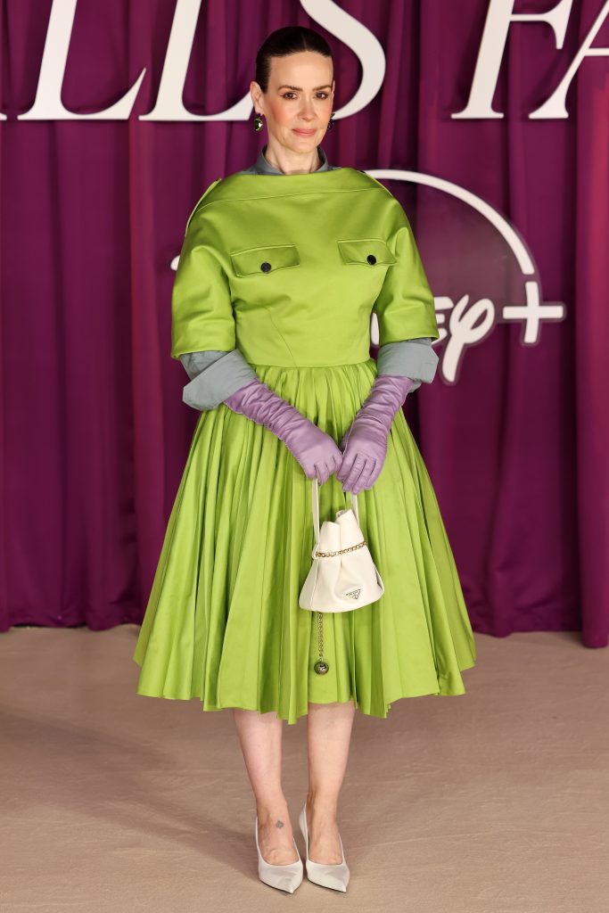 Our main star of the red carpet is Sarah Paulson, who broke her own fashion records. Three premieres – three impeccable looks from the latest collections of leading fashion houses. The first is Bottega Veneta with a recycled fiberglass skirt. After – Prada total set: a green dress combined with purple gloves. And finally – a pair of Schiaparelli trousers and a necklace with huge rhinestones. Right now Sarah is clearly in her prime.