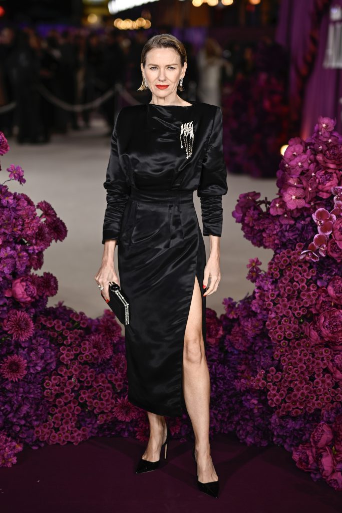 Naomi Watts proves once again that her style is a perfect balance between classic and straightforward. The first look is Schiaparelli: a white satin maxi skirt and a glossy black top with massive shoulders, an accent that has been gaining popularity lately. Then a “lightly nude” Valentino couture look with a sheer lace top and an unusually shaped black midi skirt. And finally, the third look is an incredible black satin dress with huge shoulders and an accent brooch. It’s a look with old Hollywood chic that Naomi manages to embody flawlessly.