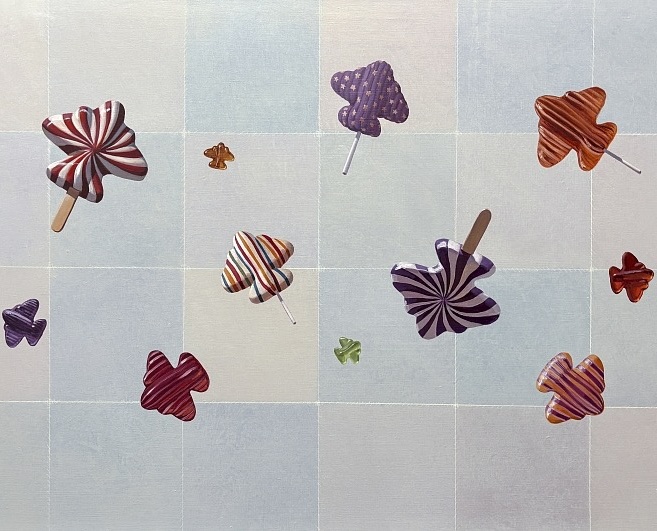 The exhibition, which is not complex, represents the artist’s canvases with an interesting nuance in the usual surrealism – the artifacts are written on a red canvas that gives them an unexplained glitter and charm.